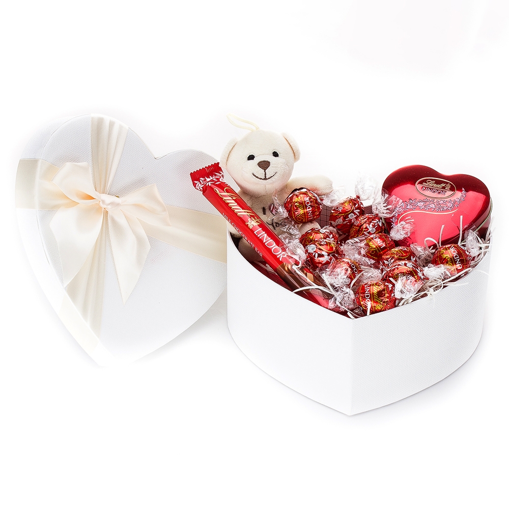 :Кутия във формата на сърце - малка бяла Шоколадово сърце Lindor метална кутия 50 гр. - 1 бр. Стик Lindt chocolate bar 38 гр. - 1 бр. Плюшено мече I love you - 1 бр. Насипни бонбони Lindor - 11 бр
