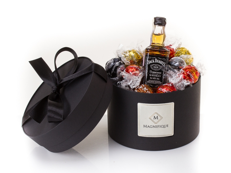 :Луксозна цилиндрична подаръчна кутия със сатенена панделка Magnifique размери 130/105 Бонбони Lindt Lindor assorted - 12 бр. Уиски Jack Daniels 0.05 ml (миниатюра) - 1 бр.