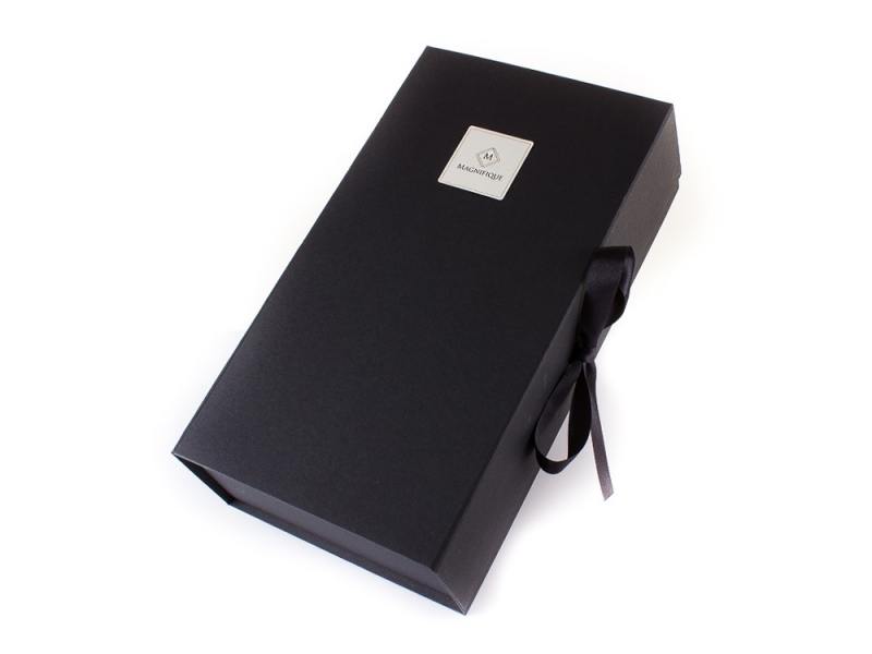 :Луксозна подаръчна кутия със сатенена панделка Magnifique с размери 335/190/90 Уиски Johnie Walker Red Label 700 ml - 1 бр. Бадемов турон El Almendro - 1 бр. Биологичен лешников крем Nocciolata Rigoni 270 g - 1 бр. Ядки печени Rois Pre