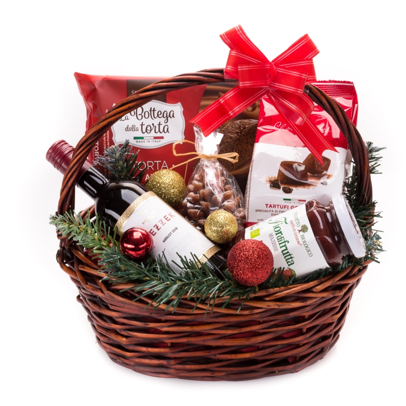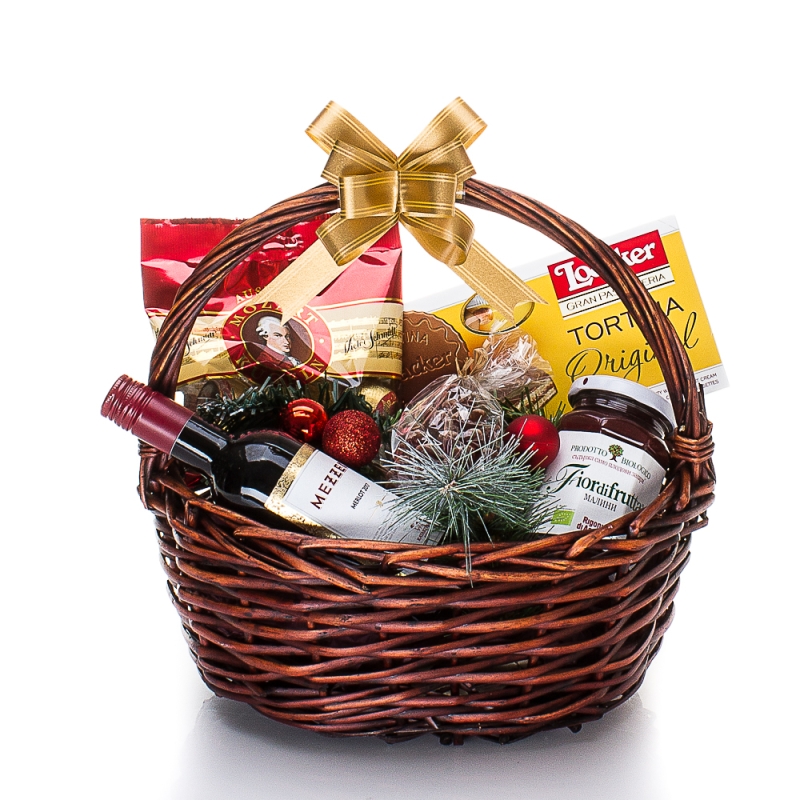 :Кошница малка - дължина 29 см., ширина 22 см., височина 12 см. - 1 бр. Италиански шоколадов кейк La Bottega della Torta 400 гр. - 1 бр. Червено вино Katarzhyla Mezzek 0.200 л - 1 бр. Трюфели с какаов пълнеж Chocolitaly 85 гр. - 1 бр. B