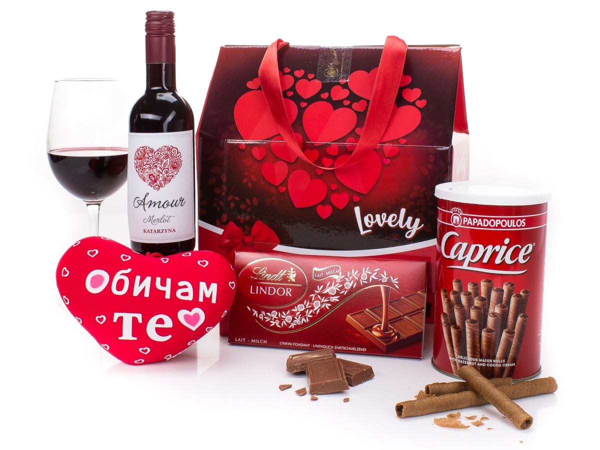 :Подаръчна кутия със сатенена панделка Lovely Шоколад Lindt Lindor 100 гр. - 1 бр. Пурички с лешников крем Caprice 250 гр. - 1 бр. Меко сърце играчка - 1 бр. Червено вино Katarzhyna Amour 0.250 л - 1 бр.