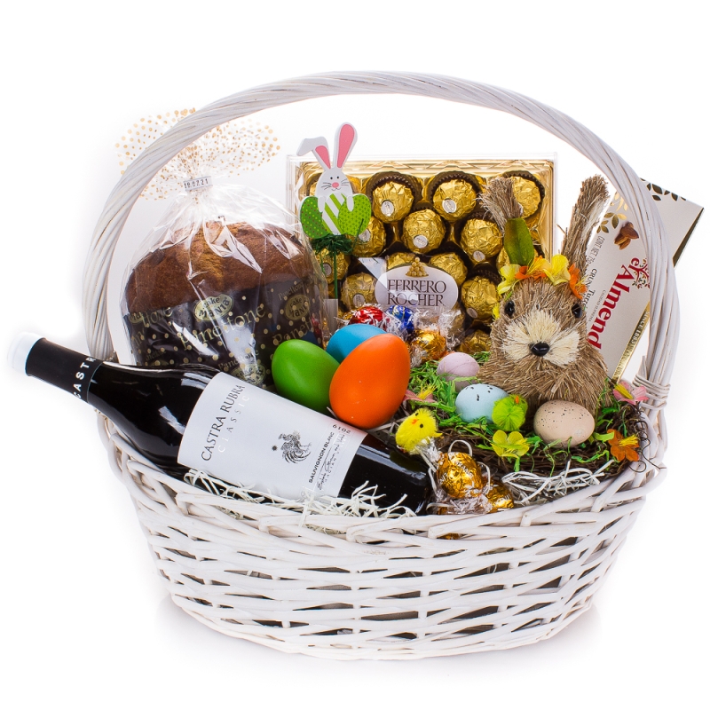 :Кошница голяма бяла - дължина 40см., ширина 32 см., височина 14 см. - 1 бр. Бяло вино Castra Rubra Sauvignon Blanc 0.750 мл. - 1 бр. Панетоне с какаови парченца и портокалови корички 500 гр. - 1 бр. Шоколадова бонбониера Ferrero Rocher 300 гр. - 1 бр. Ба
