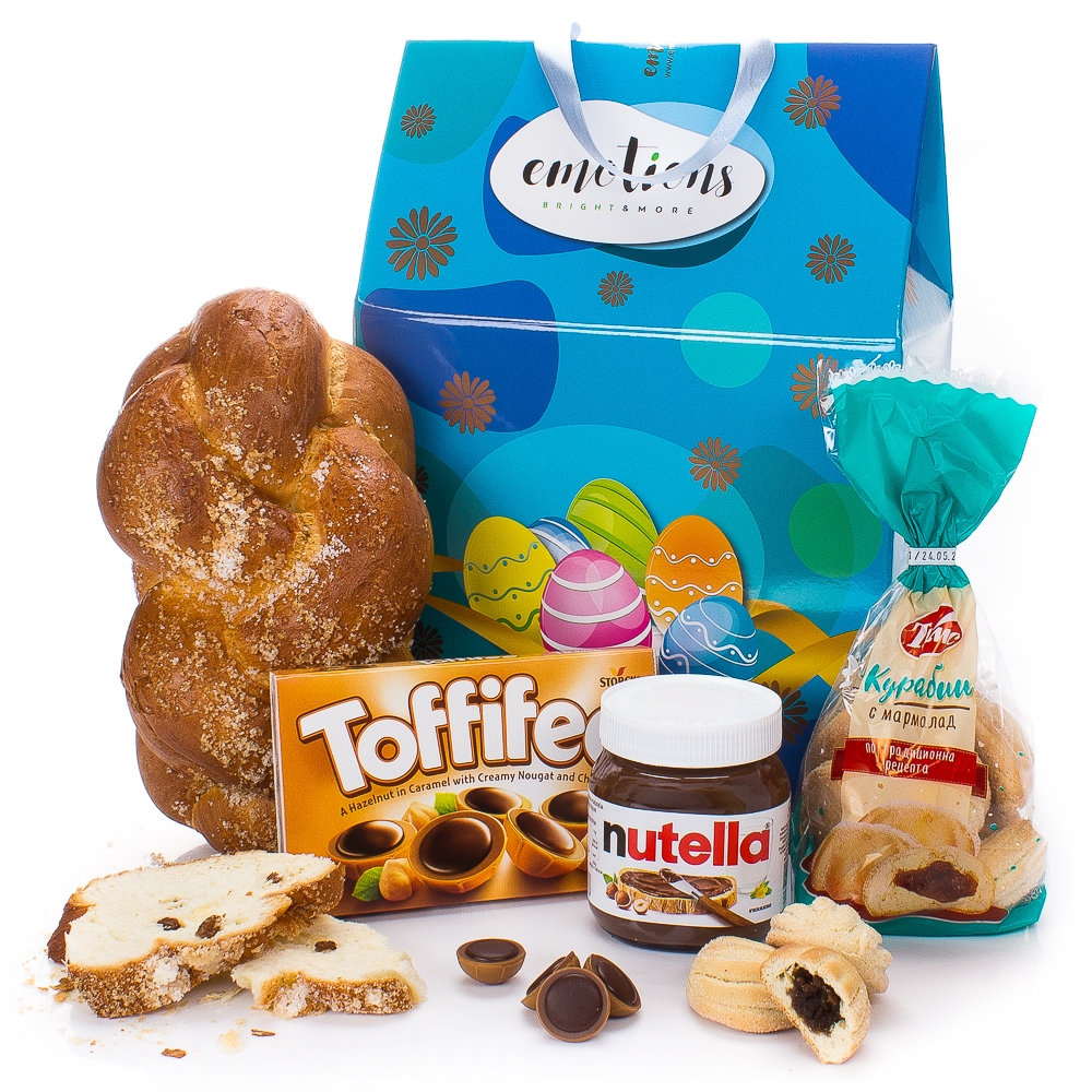 :Подаръчна кутия Emotions Bright and more Български козунак 500 гр. - 1 бр. Курабии с мармалад 250 гр. - 1 бр. Бонбони Toffifee 125 гр. - 1 бр. Течен шоколад Nutella 400 гр. - 1 бр