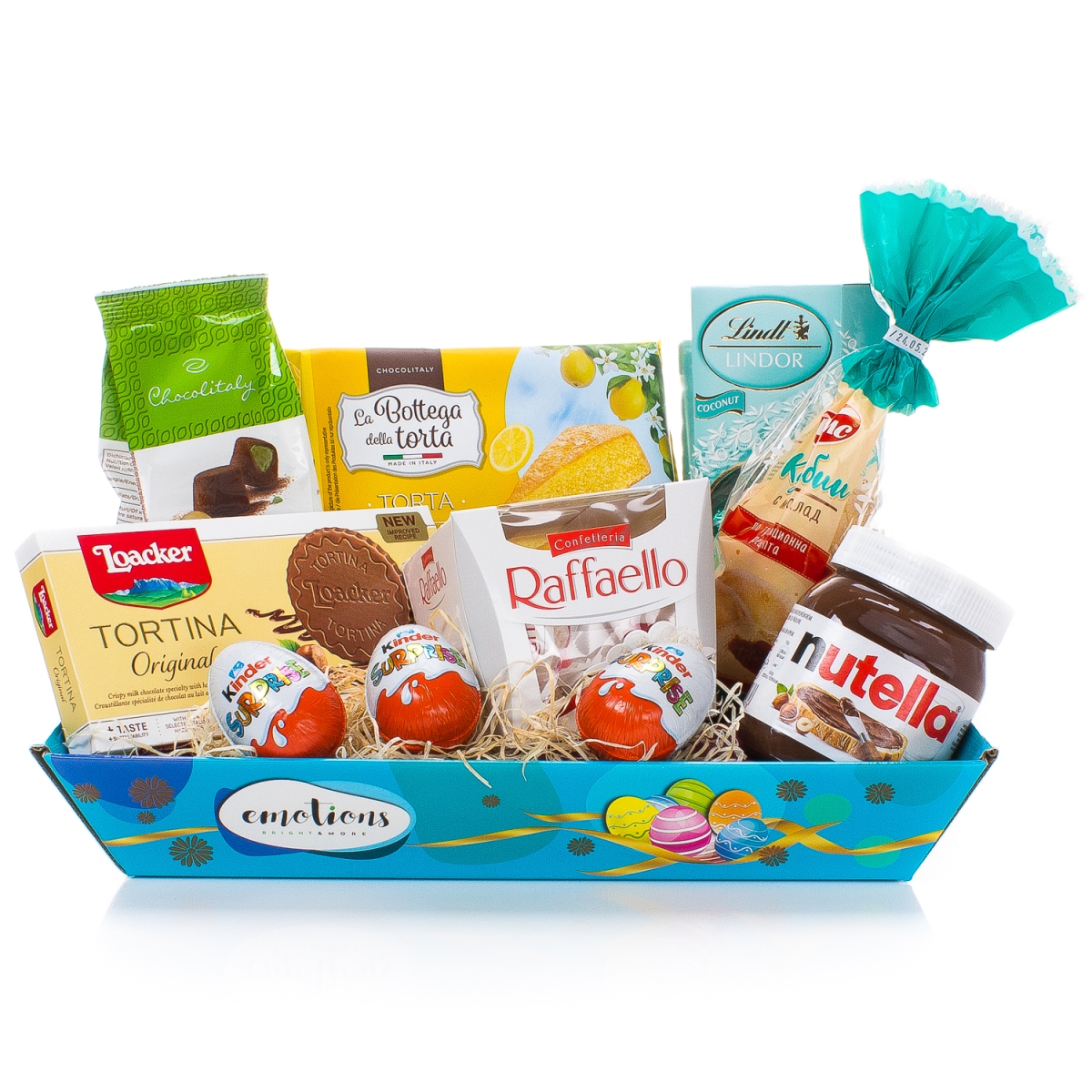 :Лимонов кейк La Bottega della Torta 400 гр. - 1 бр. Шоколадови бонбони Lindt Cornet Coconut 200 гр. - 1 бр. Шоколадови трюфели с пълнеж от шам-фъстък Chocolitaly 85 гр. - 1 бр. Течен шоколад Nutella 400 гр. - 1 бр. Вафлички Loacker Tortina Original 125 гр