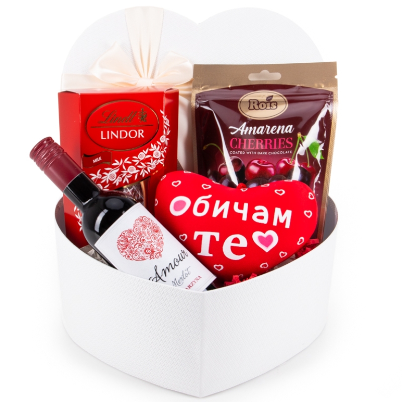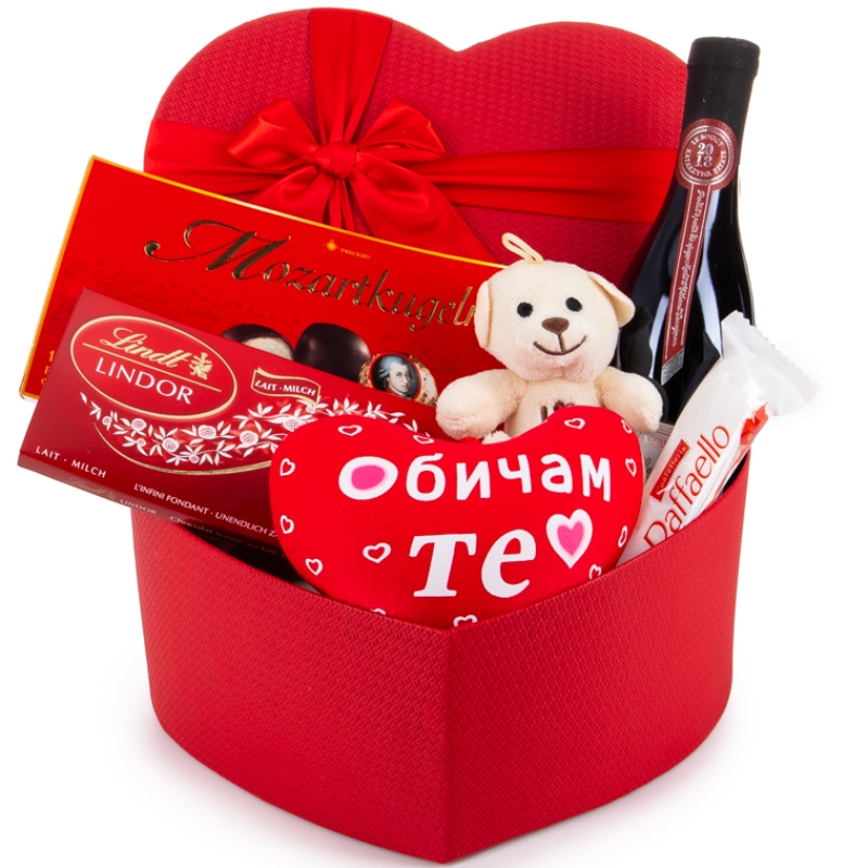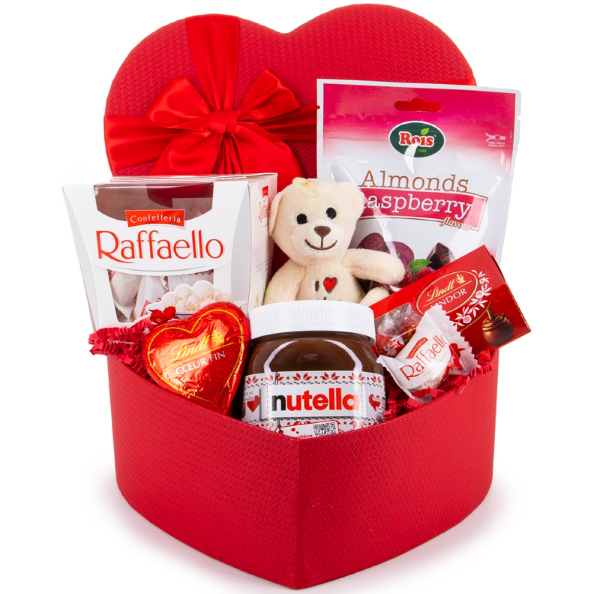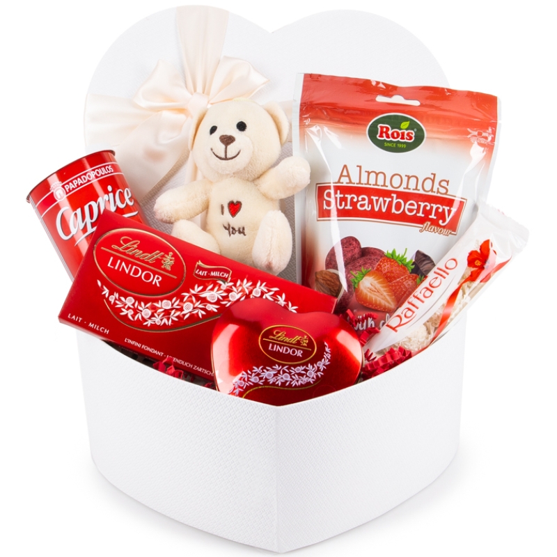 :Средна подаръчна кутия във формата на сърце Плюшено мече Бонбони Raffaello 150 гр. - 1 бр. Бадеми с покритие от млечен и бял шоколад с ягоди - 100 гр. - 1 бр. Шоколадови бонбони Lindt - 4 packs - 1бр Шоколадово сърчице Lindt 24 g -