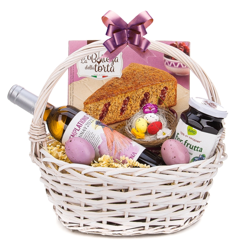 :Кошница малка бяла - дължина 25 см., ширина 20 см., височина 11 см. - 1 бр. Бяло сухо вино Contemplations Sauvignon Blanc 2022 Katarzyna 375 мл. – 1 бр. Италиански кейк с череша La Bottega della Torta 400 гр. - 1 бр. BIO конфитюр Rigoni 250 гр. - 1 бр. Де