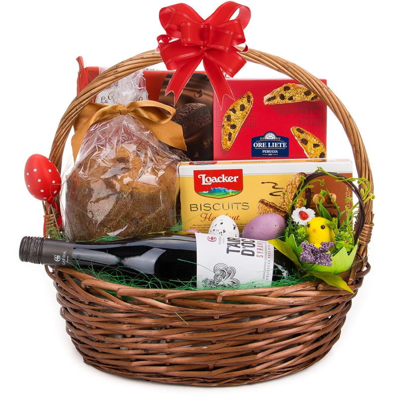 :Кошница голяма кафява - дължина 35 см., ширина 30 см., височина 13 см. Червено вино T’air d’Oc 750 ml - 1 бр. Италиански шоколадов кейк La bottega dela Torta 400 гр. - 1 бр. Класическо Панетоне Melegatti 500 гр. - 1 бр. Кантучини ORE LIETE 180 гр. – 1 бр.