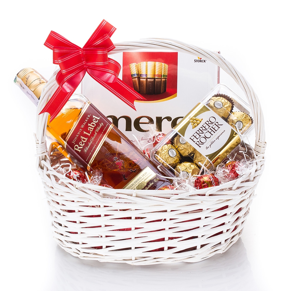 Съдържание на Кутията:Кошница малка бяла - дължина 29 см., ширина 22 см., височина 12 см. - 1 бр. Шоколадови бонбони Merci Red 250 гр. - 1 бр. Шоколадови бонбони Ferrero Rocher 200 гр. - 1 бр. Насипни бонбони Lindor - 8 бр. Уиски Johnie Walker red label 0