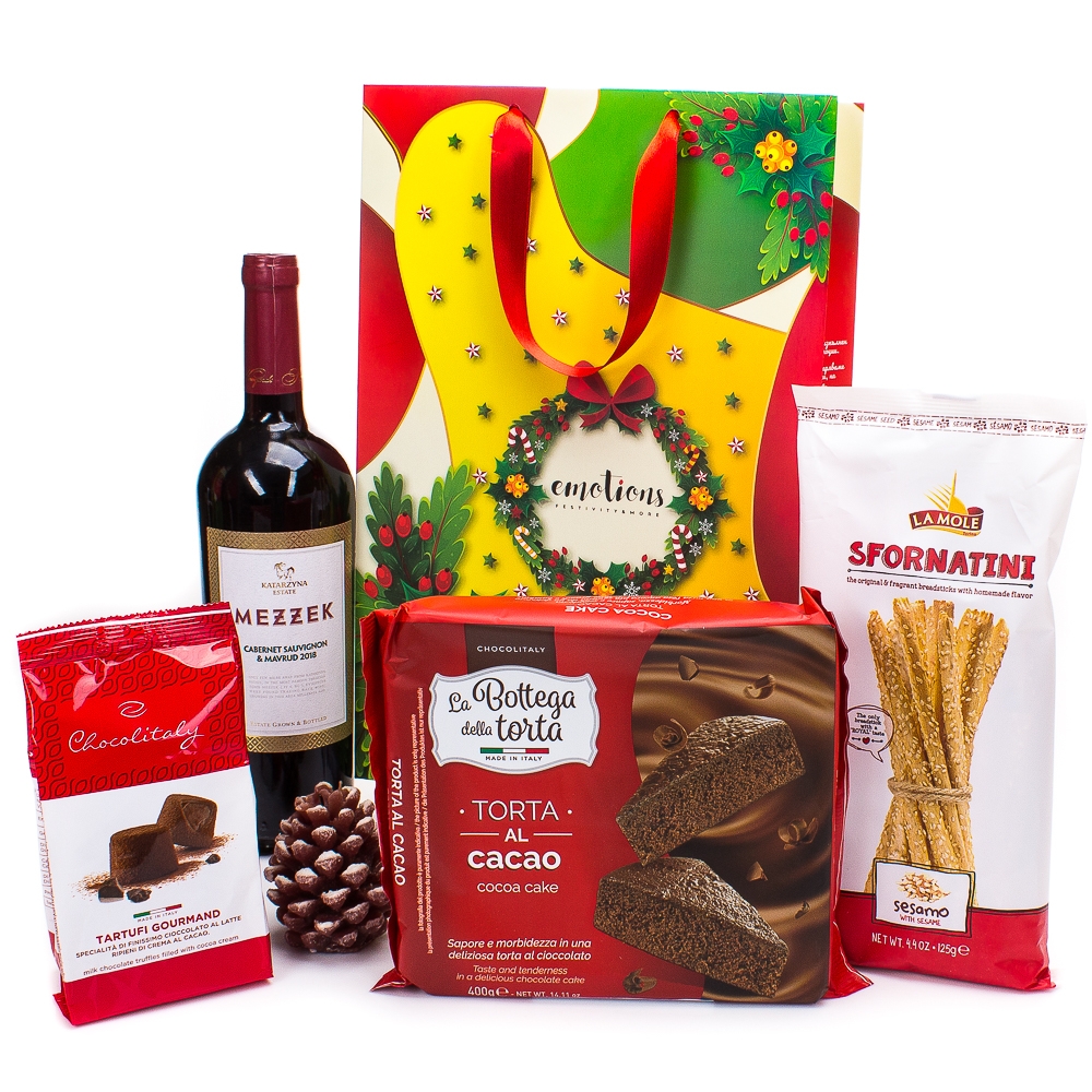 Съдържание на Кутията:Празнична подаръчна торбичка Emotions Festivity and more Червено вино Katarzhyna Mezzek 0.700 л - 1 бр. Гризини Sfornatini La Mole 125 гр. - 1 бр. Шоколадов кейк La bottega dela Torta 400 гр. - 1 бр. Шоколадови трюфели с какаов пълнеж Chocolitaly 85 гр. -